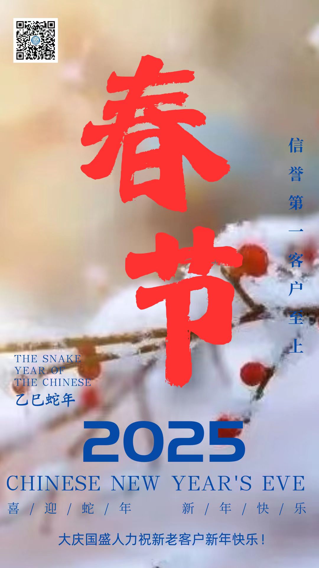 鞭炮聲聲,喚醒了沉睡的新年;瑞雪飄飄,帶來了新春的祝福。在這辭舊迎新的美好時刻,大慶市國盛人力資源管理有限公司向一直以來支持和信任我們的客戶、合作伙伴,以及每一位關(guān)注我們的朋友,致以最誠摯的新年祝福!