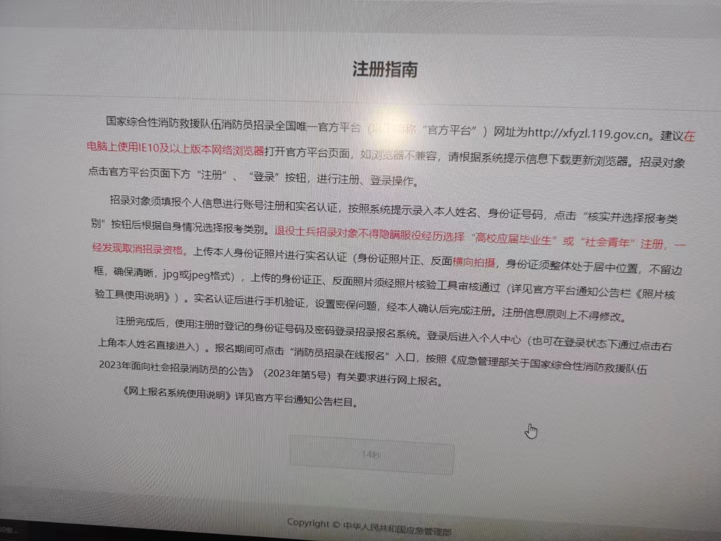 點(diǎn)擊進(jìn)入后按下圖順序先注冊(cè),再登錄。開始按耍求上傳個(gè)人信息。報(bào)名分三個(gè)端口,1、退伍軍人。2、高校畢業(yè)生。3、社會(huì)青年。學(xué)員可認(rèn)真看招聘公告,根據(jù)公告標(biāo)誰要求選自己符合對(duì)應(yīng)的標(biāo)準(zhǔn),主要是年齡和學(xué)歷。根據(jù)自己的戶籍地點(diǎn)擊報(bào)名省份和所在城市。確認(rèn)無誤后在點(diǎn)擊申請(qǐng)發(fā)送,報(bào)名只有一次修改機(jī)會(huì)!高中學(xué)歷22歲以下,大專學(xué)歷24歲以下,本科26歲以下。政審?fù)ㄟ^均可報(bào)名!